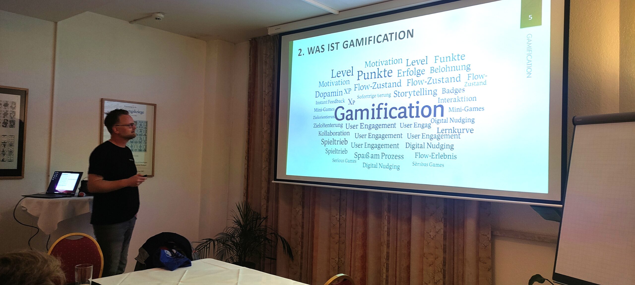 Im anschließenden Impulsvortrag zeigte Lars Ehrhardt (ProvinzPreneur), wie uns Gamification im Alltag begegnet – von digitalen Lernplattformen bis zu Bonusprogrammen – und wie Unternehmen durch gezielte Belohnungs- und Motivationsmechanismen ihre Teams nachhaltig aktivieren können.