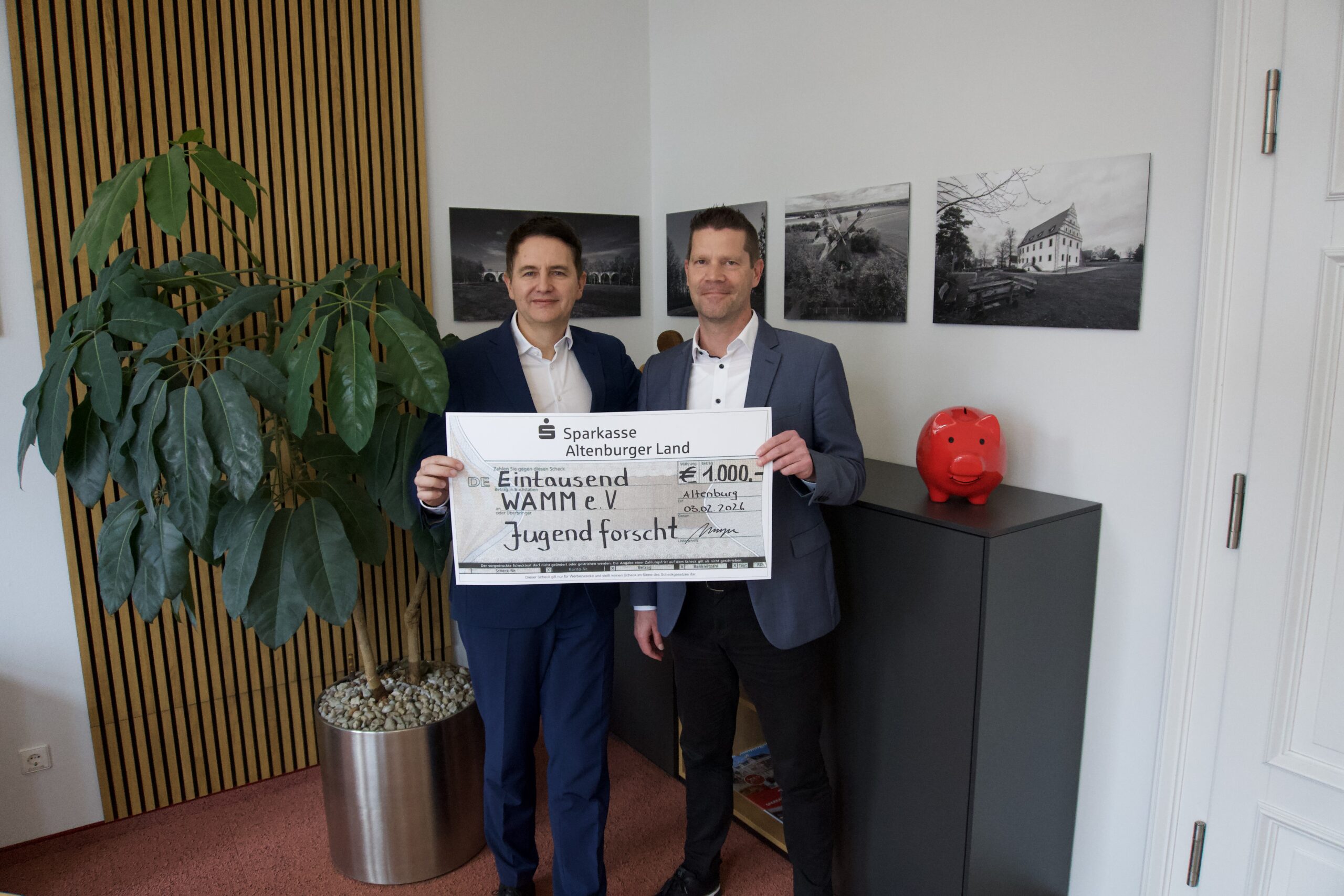Am 3. Februar überreichte Andreas Hohlfeld, Vorstandsmitglied der Sparkasse Altenburger Land, einen Spendenscheck in Höhe von 1.000 Euro an Nico Kraft, Vorstandsmitglied der Wirtschaftsvereinigung WAMM e.V.